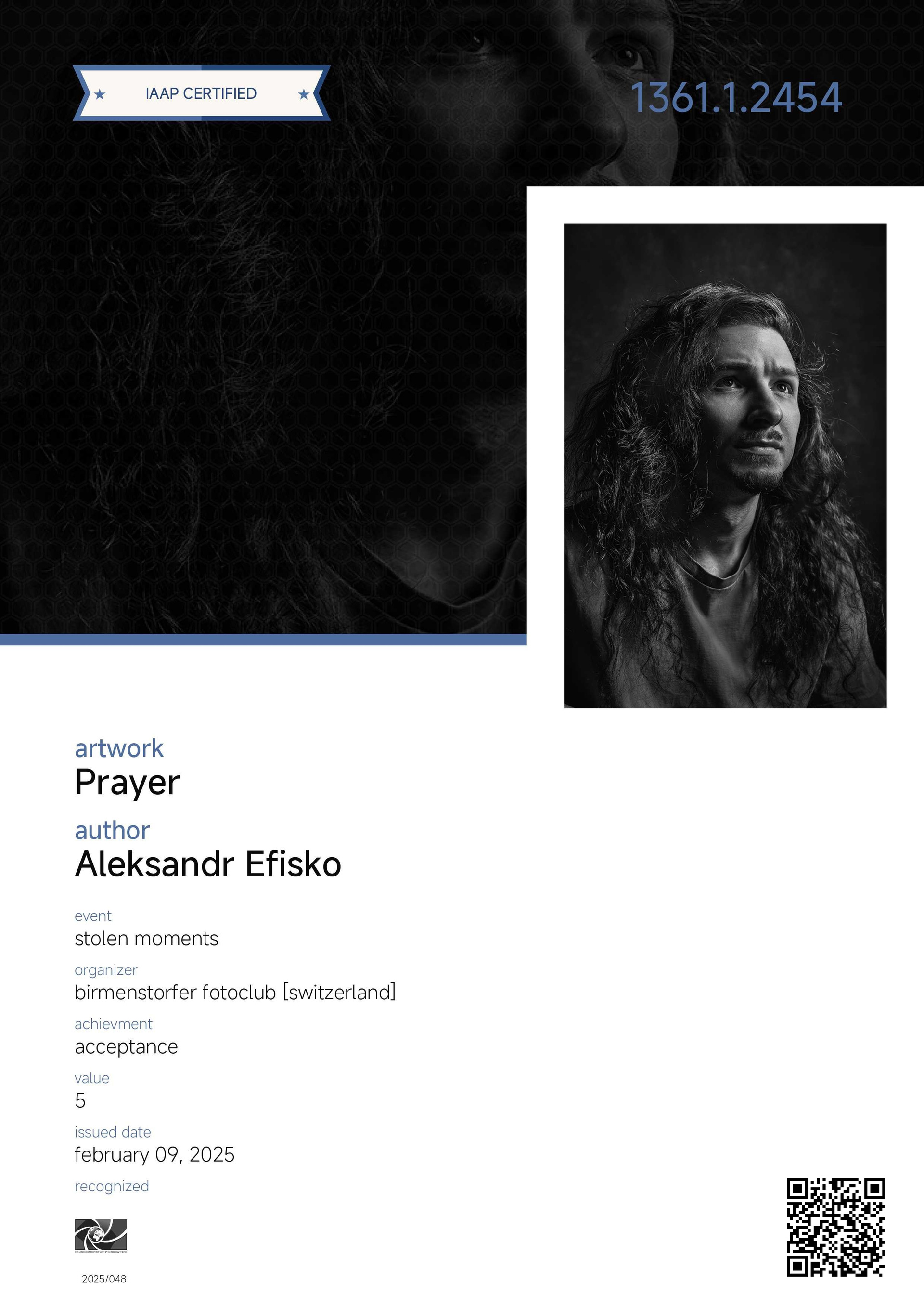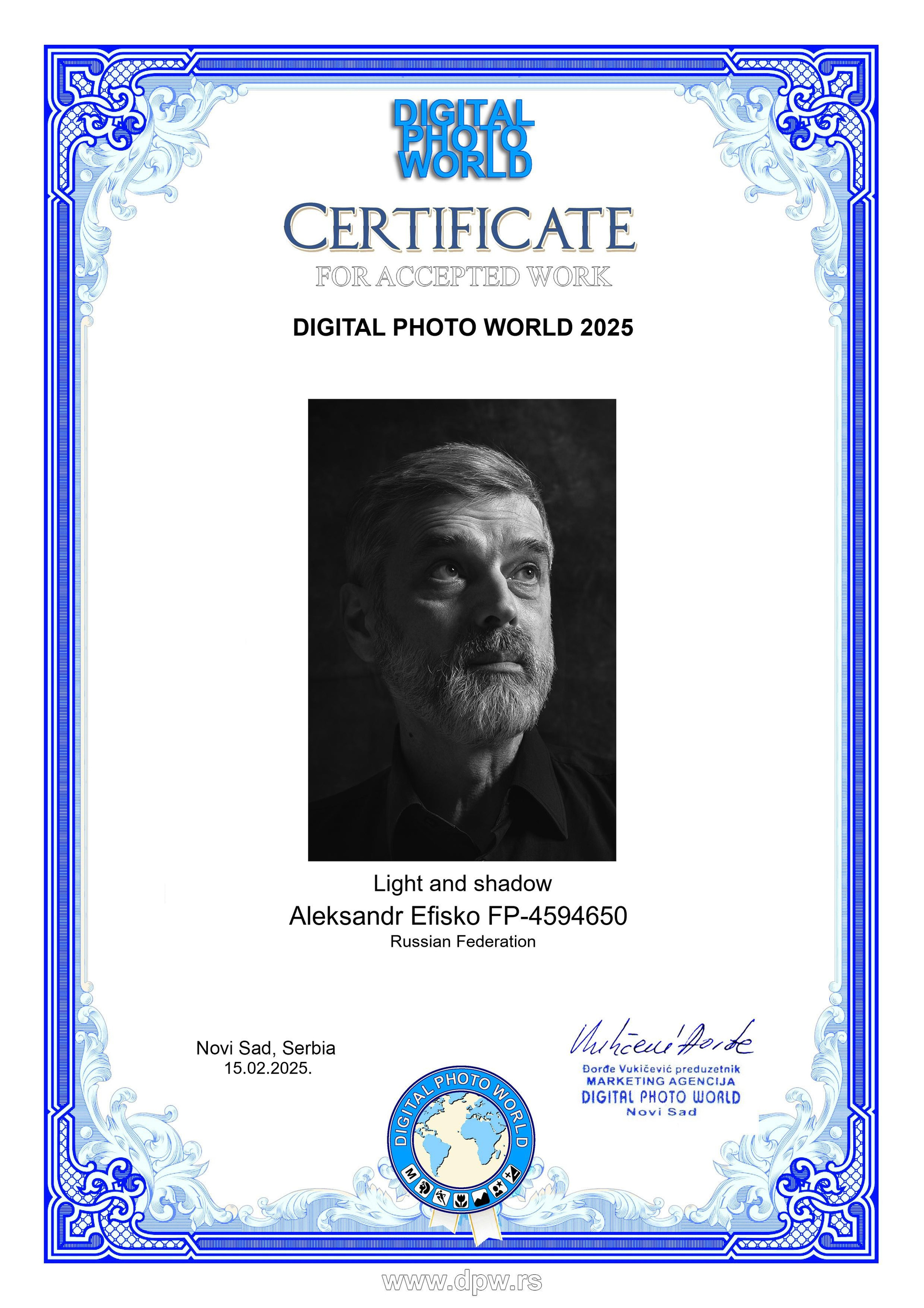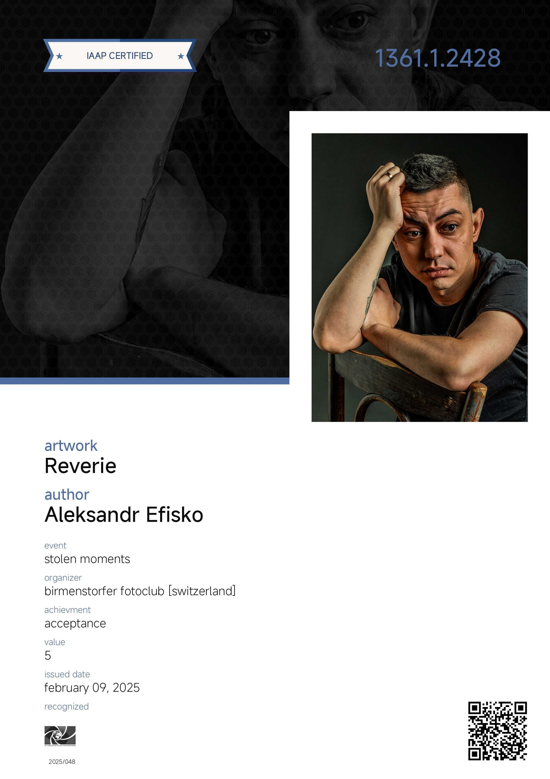 Меня зовут Александр. Я — фотохудожник A IAAP, член Ассоциации фотографов «EURASIA» и Ассоциации фотохудожников «ART PORTRAIT». Для меня фотография — это способ говорить без слов: через свет, тень и тонкие паузы между ними. Я создаю кадры, где важны не только черты лица, но и дыхание момента — то, что остаётся с вами надолго.